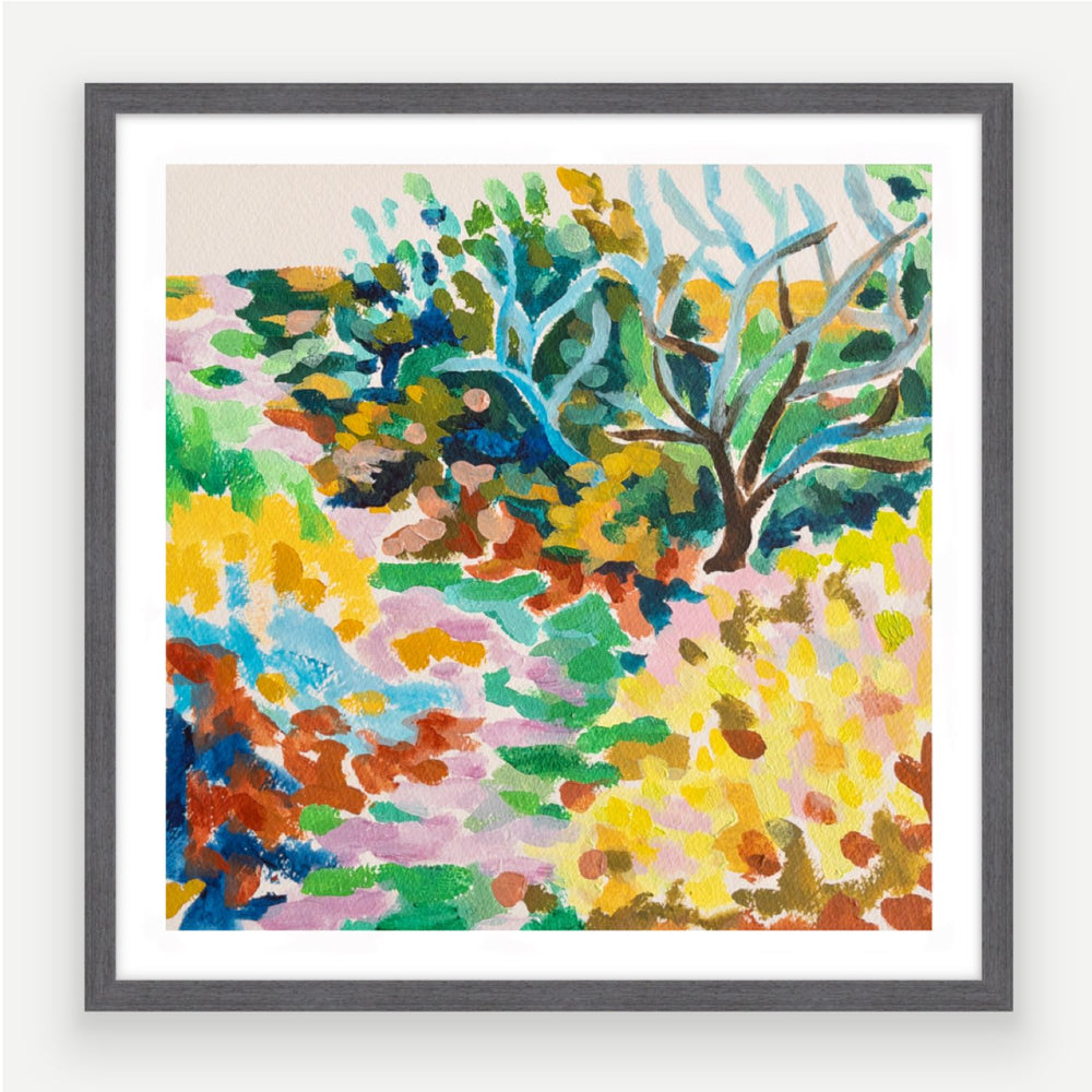 Vivid colours merge, as if the viewer is also moving, and there is a focus on white space to allow the foliage to form. This artwork is a moment caught in time using the expressive language of colour and brushstroke.