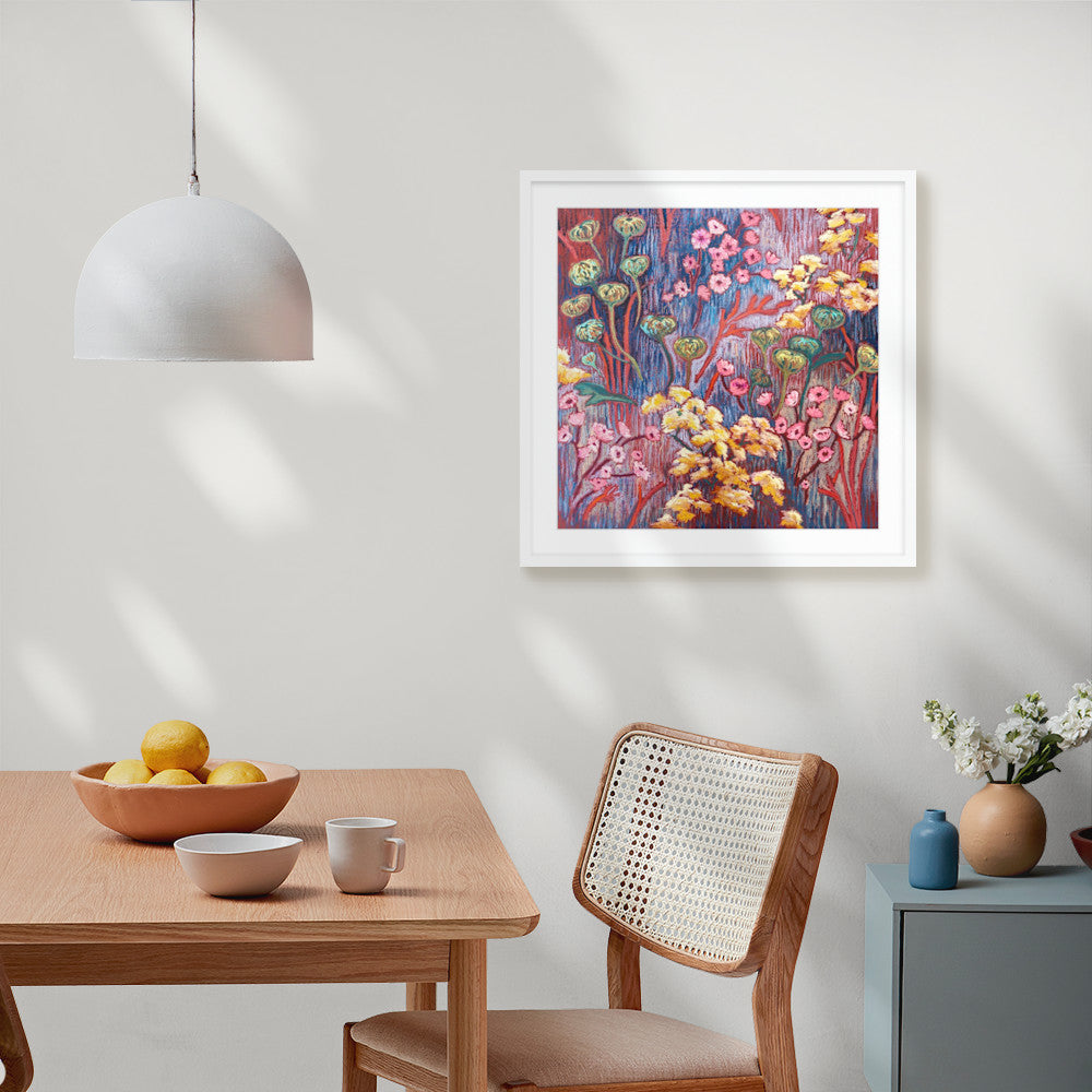 Midnight's Garden central feature is the glowing, yellow statice flower contrasting with the beautiful deep red ochre of the background. It is inspired by the opulent colour intricate floral patterns of art deco.